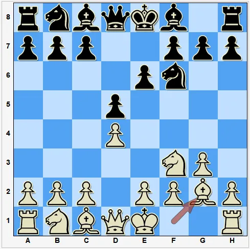 这类开局最具代表性的就是王翼印度进攻,它与黑方古印度防御子力配置差不多,只是颜色相反: