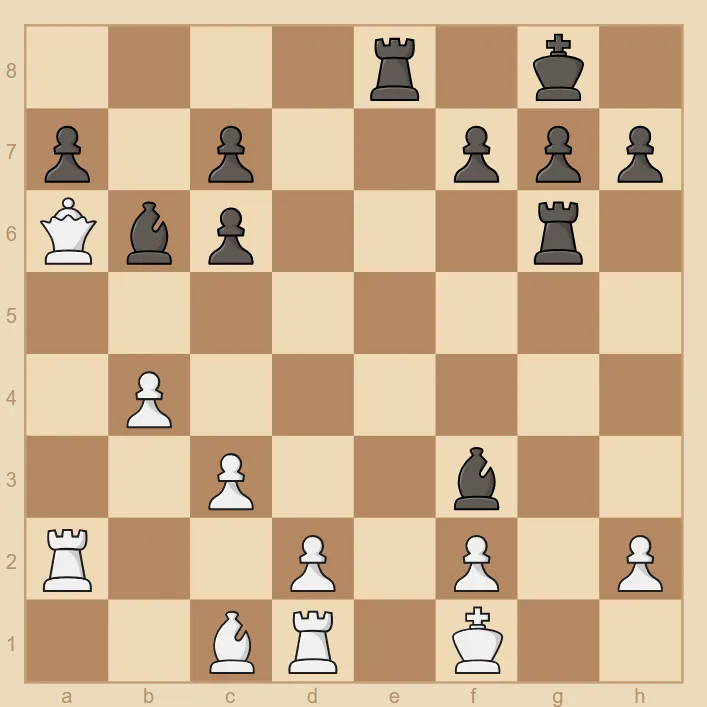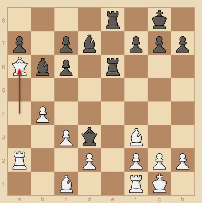 他的对手白方在当时也是一位很强的特级大师,他的开局走得不好,以致让黑后进入了d3腹地。因此白方走Qa7,想消除黑方...Qxf1,之后杀王的连着。