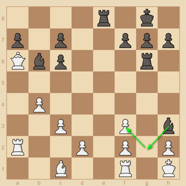 他通过破坏黑方的王翼兵型,将静态优势转化为了动态优势。这是一个你应当时刻铭记的战术技巧:当你在出子上领先时,破坏敌方王的庇护所是关键。