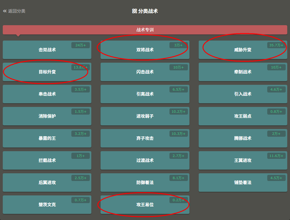 本战术因为难度较高,因此,仅部署在中级班、高级班和大师班中。及分类战术中,总题量达35.7万+。