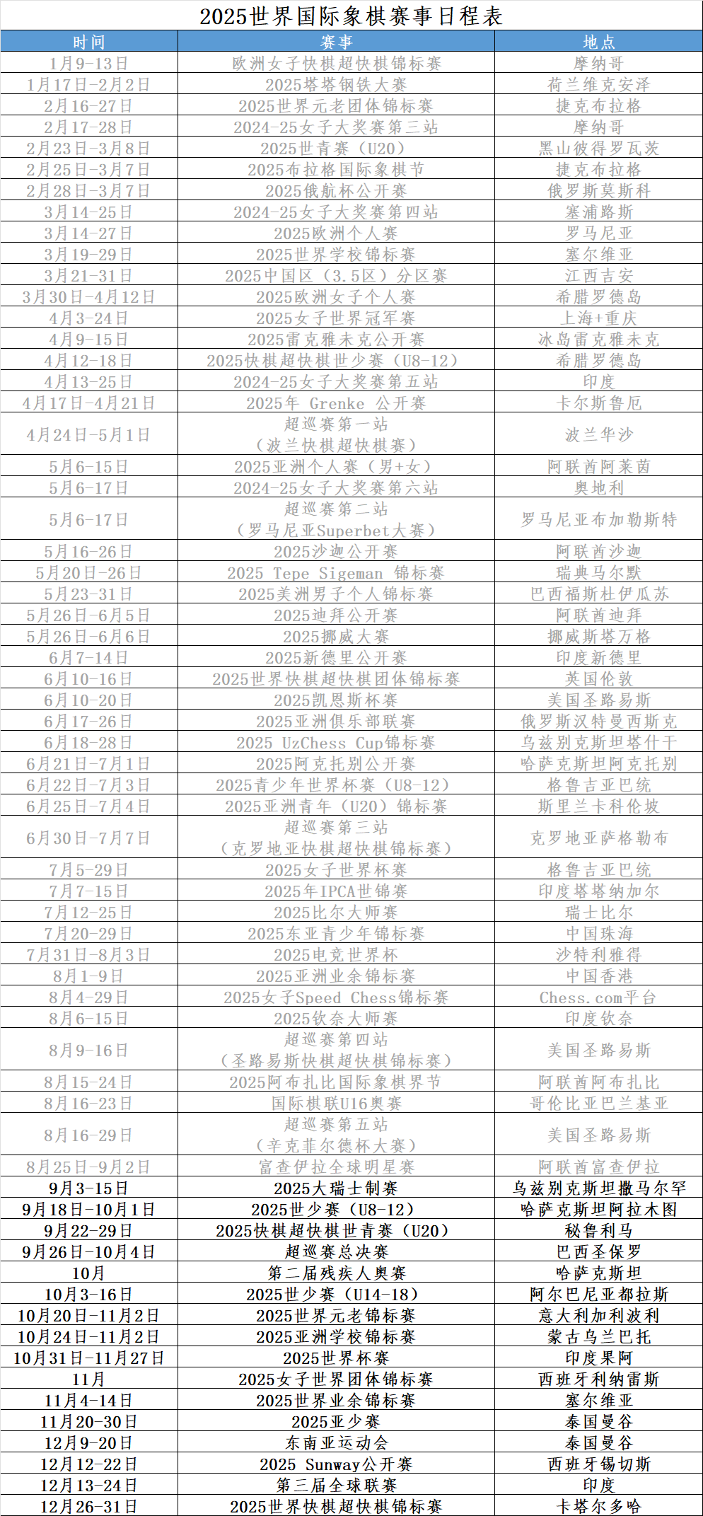 2026年国际象棋赛事日程表(3月版)