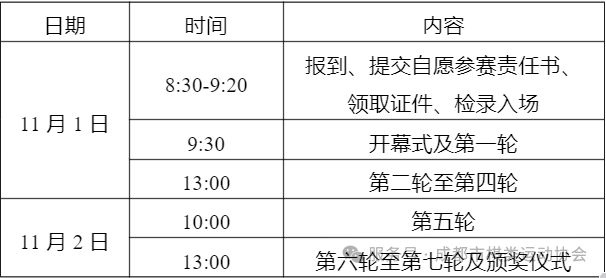 2.每轮比赛领队、教练开赛15分钟内可凭证件进入赛场拍照。15分钟后请自觉退场,保持竞赛秩序。