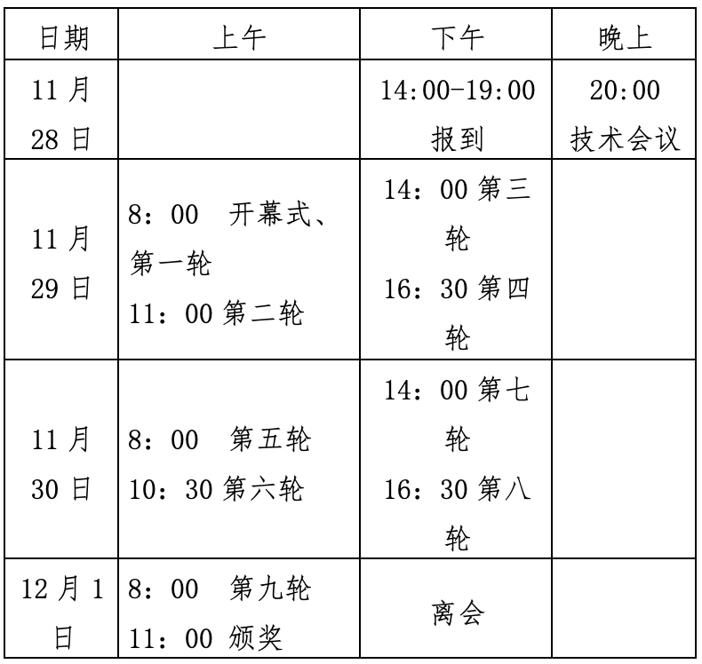 运动员须于2025年11月28日晚19:00前完成报到手续,逾期未报到者视为自动放弃参赛资格。如有特殊情况,须提前告知组委会。