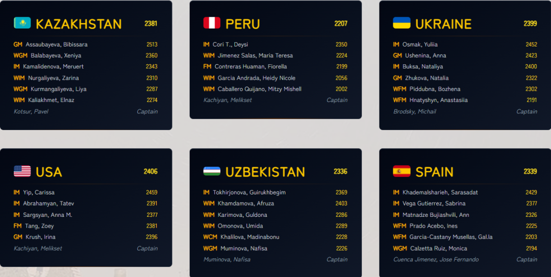 格鲁吉亚队、美国队、乌克兰队和哈萨克斯坦队等级分排在第3~6位。其中,上届冠军格鲁吉亚队由巴特西亚什维利、霍特纳什维利和雅瓦希什维利等多位老将担纲,但头号棋手扎格尼泽缺席。美国女队则由状态火热的四届全美冠军叶诗雯率领。乌克兰女队由前世界棋后乌什尼娜领衔,穆兹丘克姐妹因故缺席。朝气蓬勃的哈萨克斯坦队则派出了本国最强阵容,刚刚晋升特级大师(GM)的阿萨乌巴耶娃将坐镇一台。