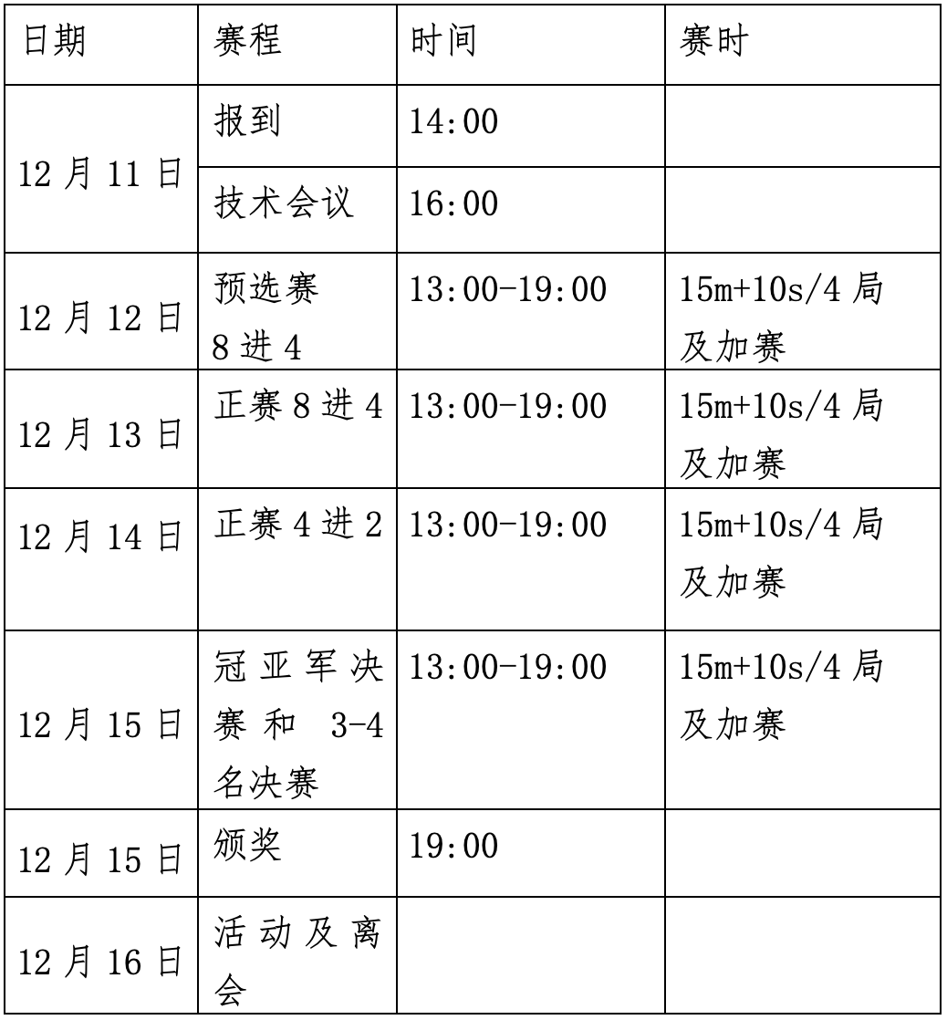 5.比赛采用每方15分钟,每步棋加10秒的时限,对弈四盘;抽签决定首盘先后手。如四局总分打平,加赛2局超快棋,每方3分钟,每步棋加2秒的时限,打平后决胜局:白方5分钟,黑方4分钟,60步以后每步棋加2秒,和棋视为黑胜,抽签决定先后手。