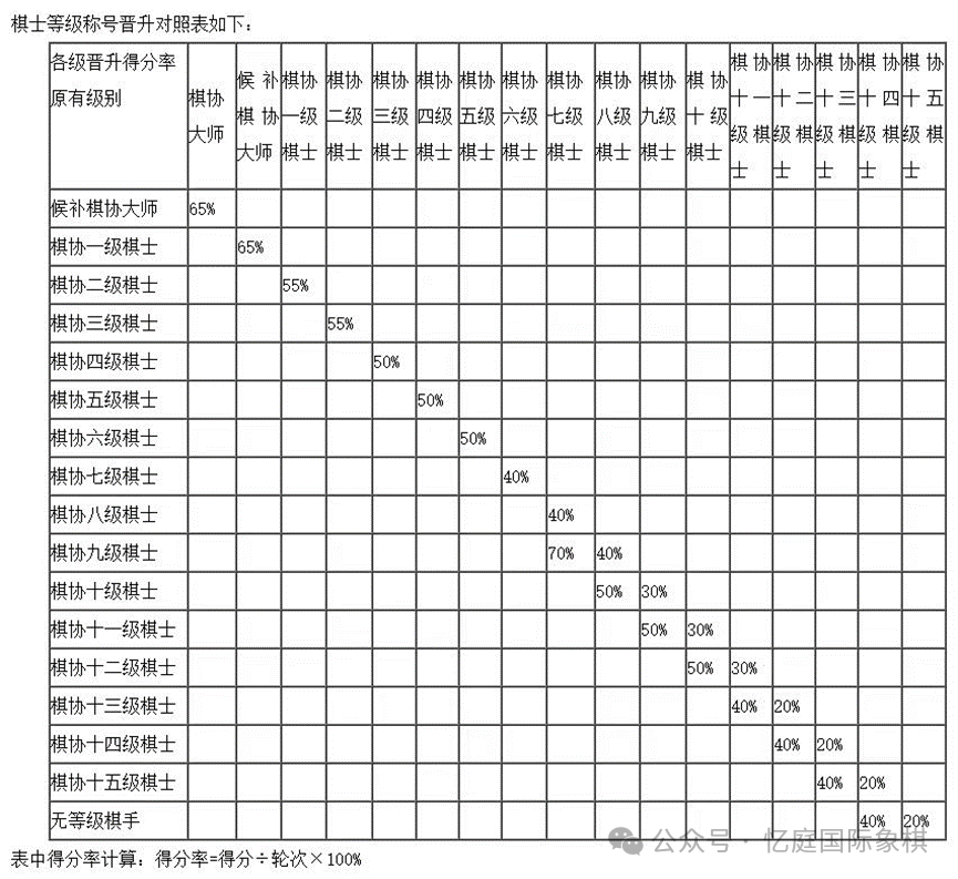2、严格遵照中国国际象棋协会所颁发的2022年最新《中国国际象棋协会棋⼠等级称号条例》中所规定的“棋⼠等级称号晋升对照表”执⾏,此次⽐赛最⾼可申请棋协⼀级棋⼠。