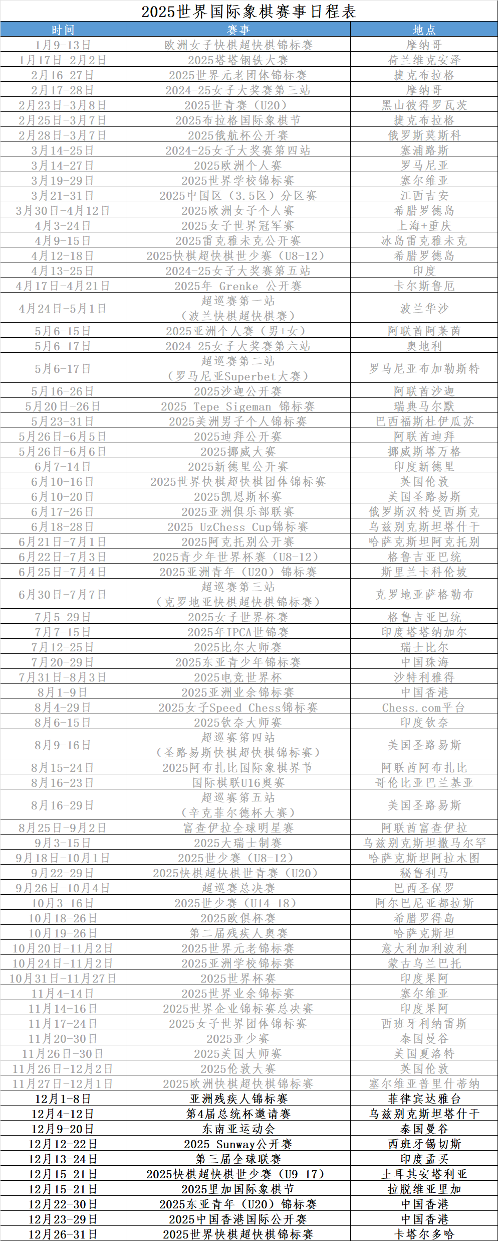 2025世界国象赛事日程表(12月版)