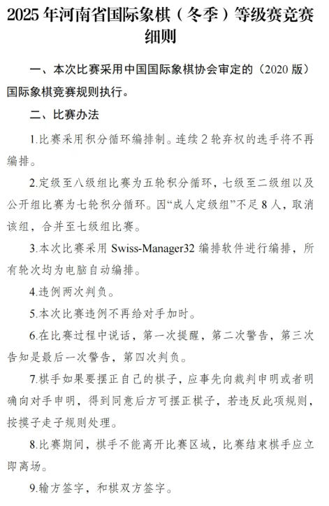 2025年河南省国际象棋(冬季)等级赛竞赛细则