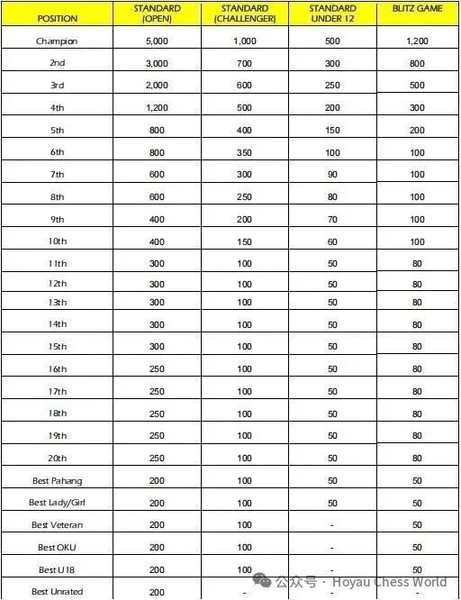 公开组奖励前20名,其中冠军5000马币,亚军3000马币,季军2000马币。挑战组奖励前20名,冠军1000马币。U12组奖励前20名,其中冠军500马币,超快棋赛奖励前20名,其中冠军1200马币。