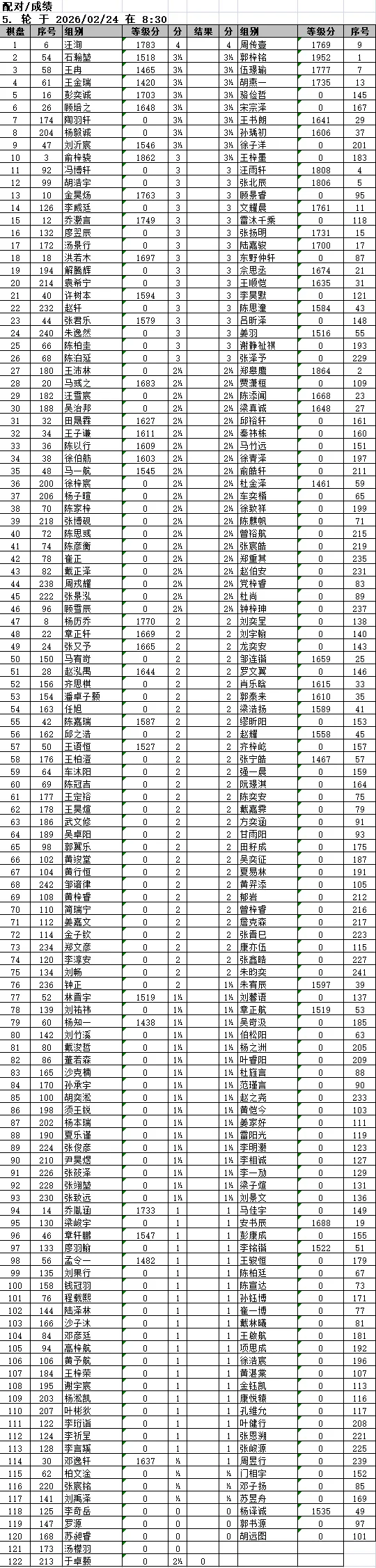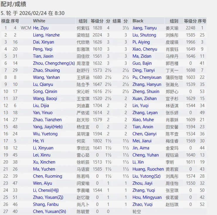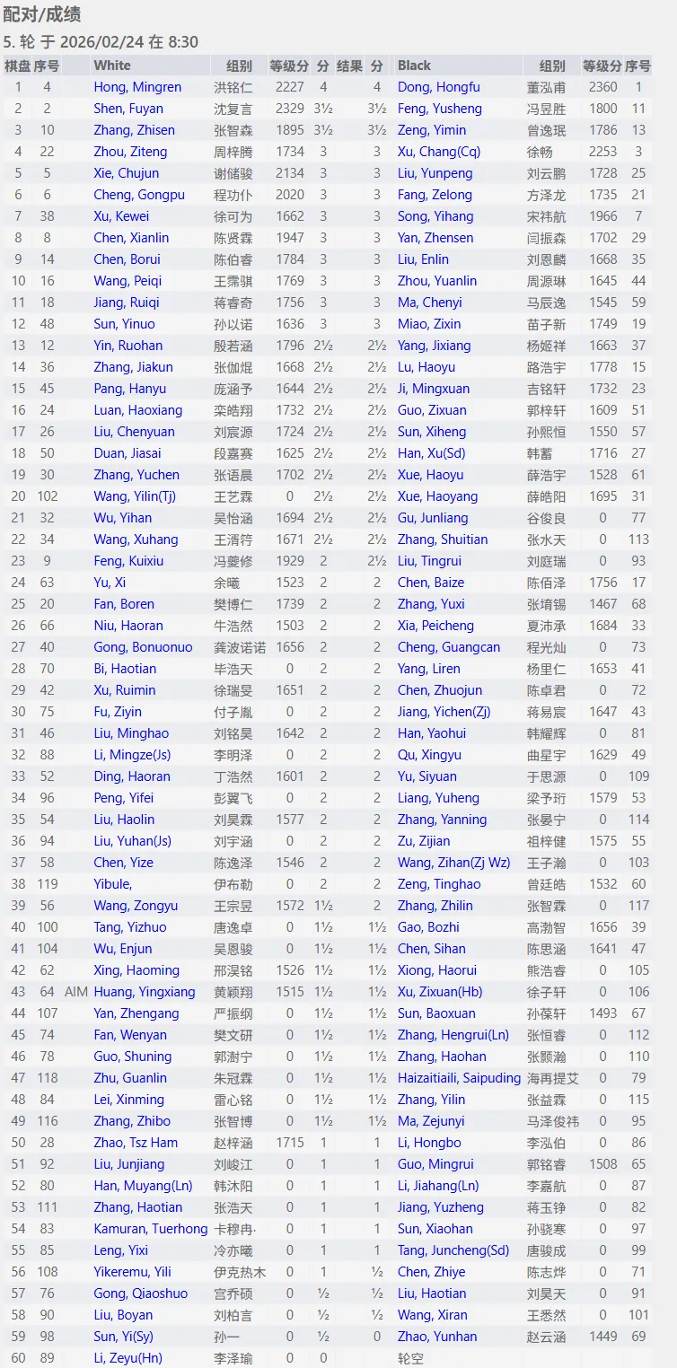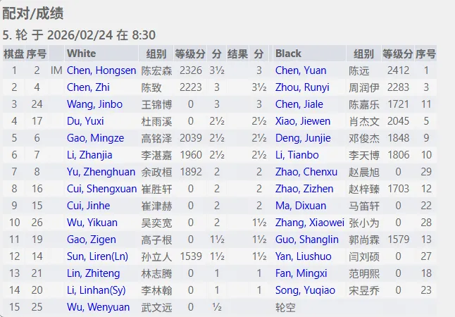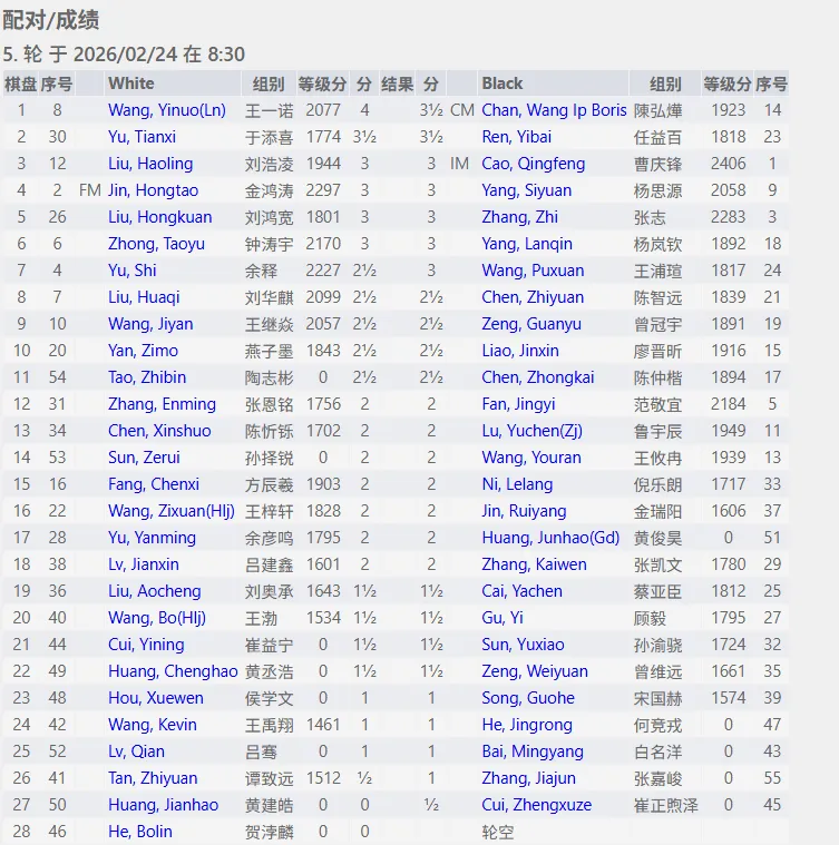 今日是2/24日,李杯进入第三天,以下为各组第5轮的编排表: