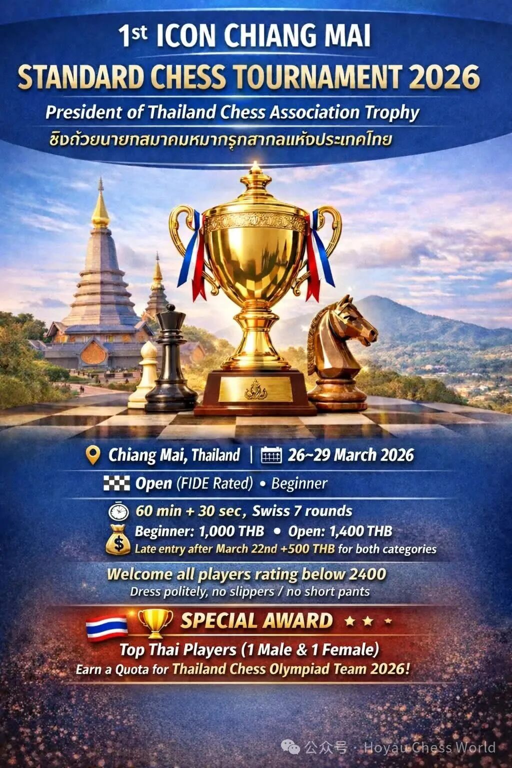 泰国国际象棋协会、泰国清迈体育局和泰国清迈国际象棋俱乐部很荣幸邀请世界各地棋手参加首届泰国清迈国际象棋公开赛,赛事将于3月26日-29日在清迈700周年纪念馆举办,本届赛事的男女子冠军将入选国象奥赛泰国队选拔名单。泰国清迈风景宜人,距离中国很近,是许多人首选的度假目的地,值得前往体验。