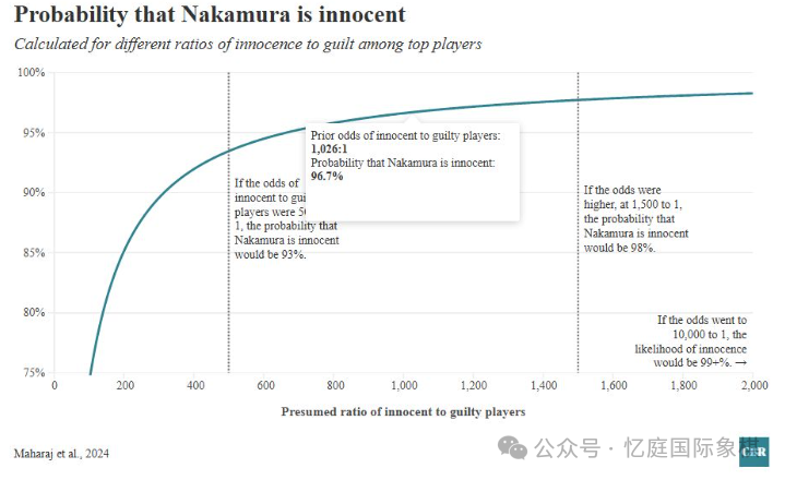 研究人员考虑了中村光相对于对手的实力差距后发现,仅从等级分概率来看,这样的连胜发生概率不足 3%;但贝叶斯分析在纳入估算的作弊发生率(线上比赛中低至万分之一)后显示,中村光清白的可能性极高 —— 概率高达 99.6%。
