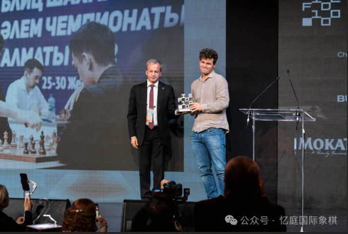 卡尔森在接受德沃尔科维奇颁发的奖项时,呼吁在 2024 年全体大会召开前夕,继续对俄罗斯和白俄罗斯代表队实施制裁。图片来源:叶梅利亚诺娃/Chess.com