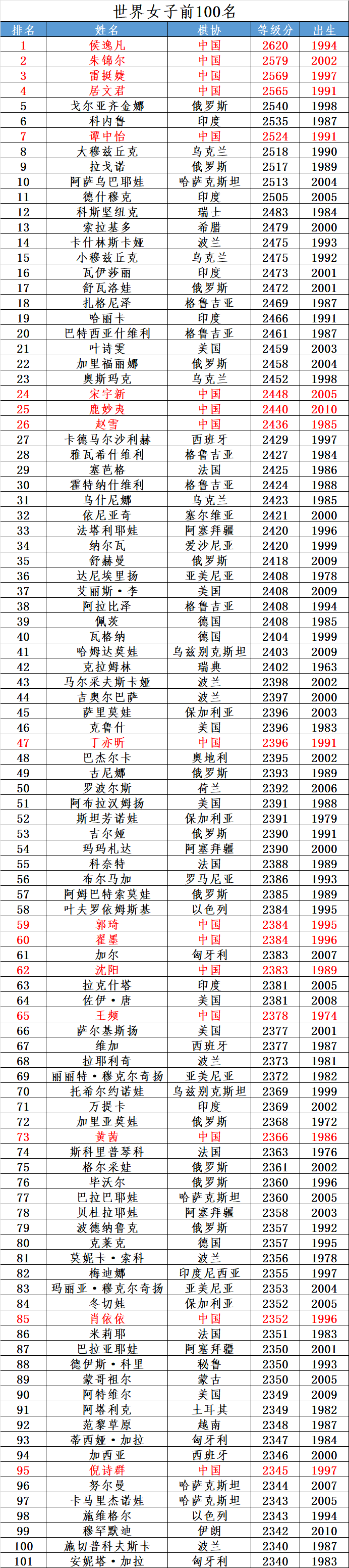 国际棋联2025年12月中国青年棋手等级分(Top20)