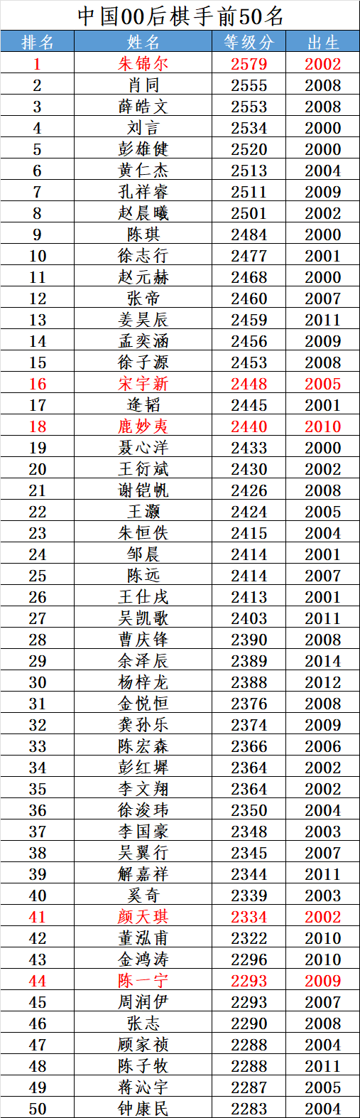 国际棋联2025年12月中国青年棋手等级分(Top20)