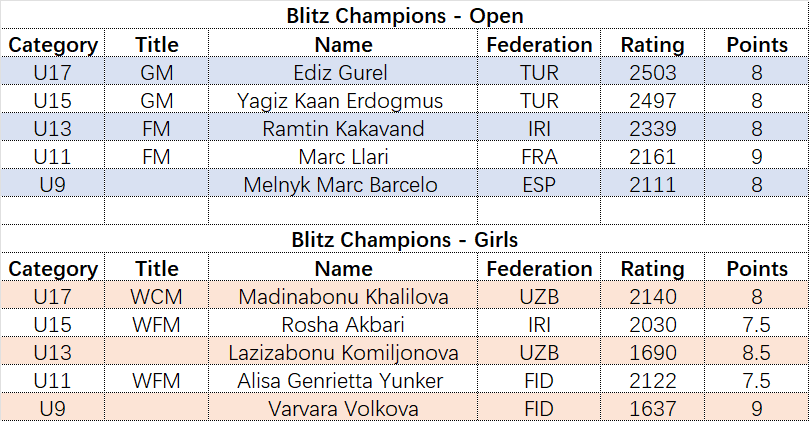 男子11岁组的法国棋手利亚里(Llari)和女子11岁组的俄罗斯云克尔(Yunker)继快棋赛夺冠后,又在超快棋赛折桂,成为全场仅有的双冠王。