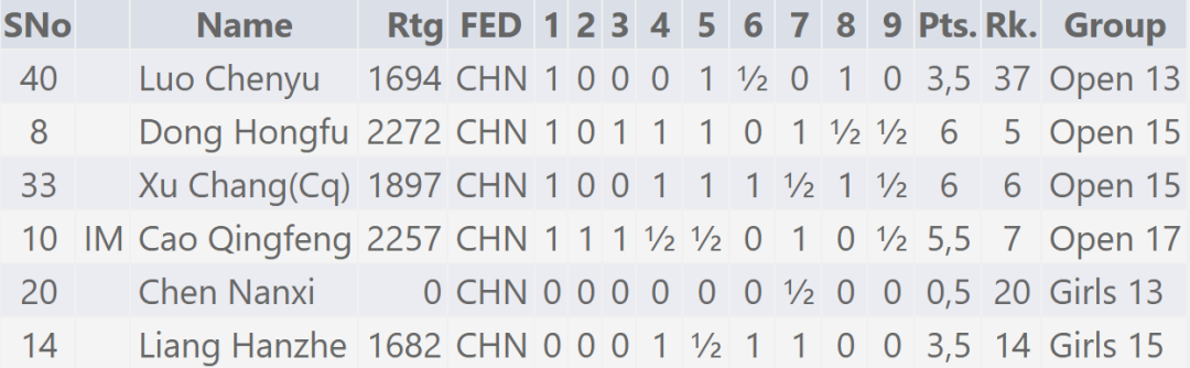 六名中国棋手的战绩如上。其中,董泓甫和徐畅同积6分,分获男子15岁组的第五和第六名。国际大师曹庆锋以5.5分,获得男子17岁组第7名。