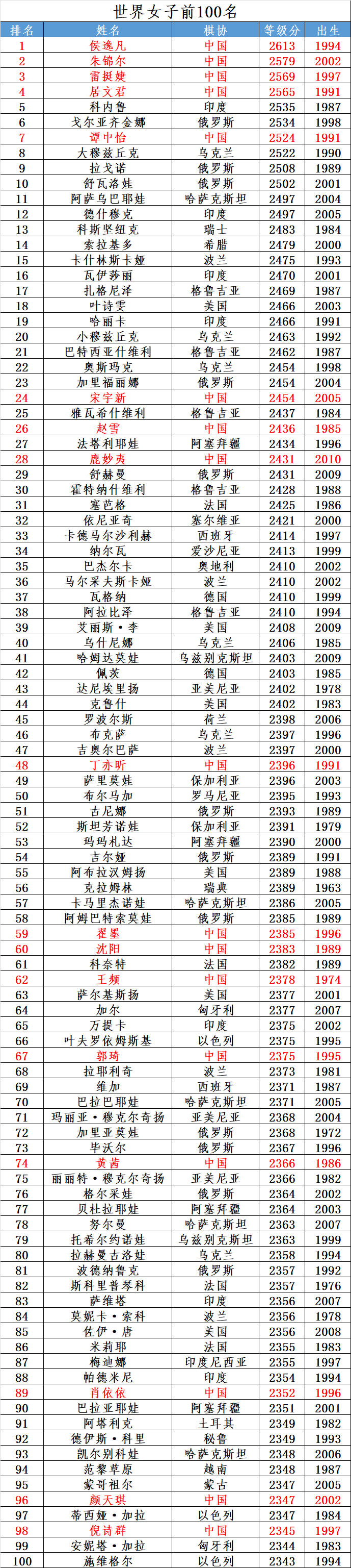 等级分 | 世界女子前100名(2026年1月)