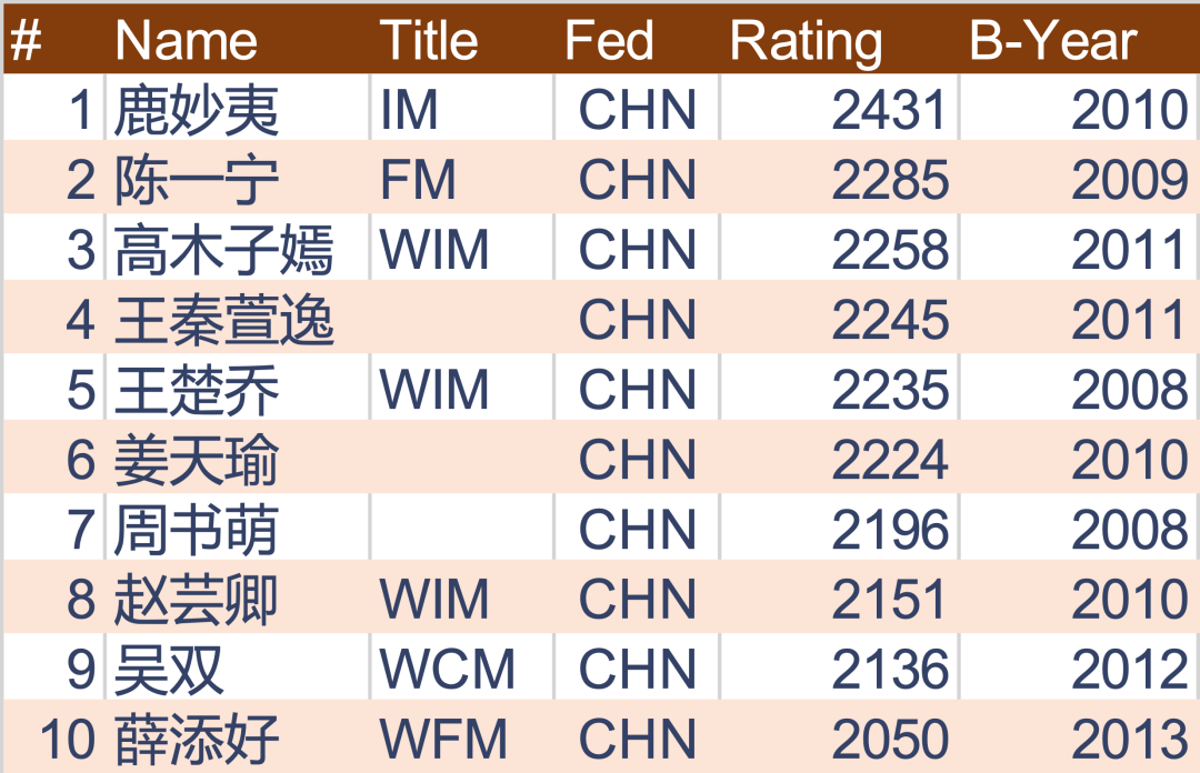 国际棋联2026年1月中国青年女子棋手等级分(Top10)