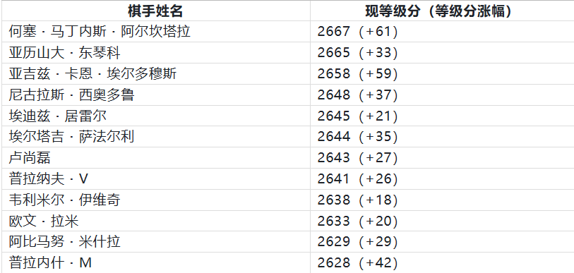 这份榜单上的多数绩优棋手都十分年轻,因此他们的进步显得顺理成章。唯一的例外是埃尔塔治・萨法尔利—— 在缺席六年之后,他重返世界百强棋手之列。凭借在印尼、德国各项赛事以及欧洲俱乐部杯赛中的优异表现,他的等级分足足上涨了 35 分。