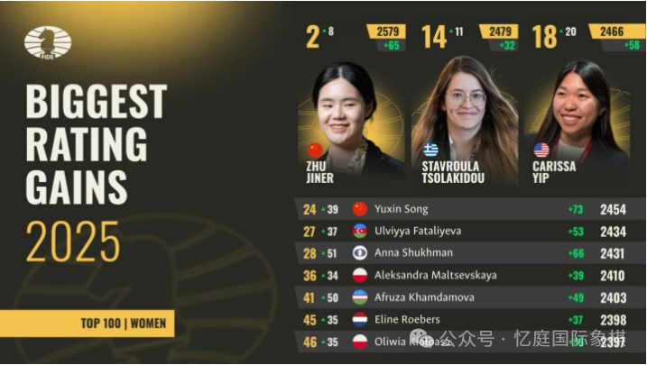 在年初位列百大的棋手之中,宋宇新(等级分 + 73)与安娜・舒赫曼(等级分 + 66)的积分增幅最为显著。两人在 2025 年初均为顶尖青年棋手,年终时已成功闯入女子棋手前 30 名。