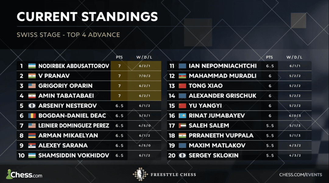 经过九轮瑞士制的激烈争夺,阿卜杜萨托罗夫(乌兹别克斯坦)、普拉纳夫·V(印度)、奥帕林(美国)和塔巴塔巴伊(伊朗)四人同积7分,晋级半决赛。