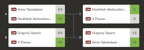 15日进行了半决赛和决赛。半决赛中,阿卜杜萨托洛夫以1.5比0.5战胜塔巴塔巴伊,世青赛冠军普拉纳夫·V以相同比分击败奥帕林。