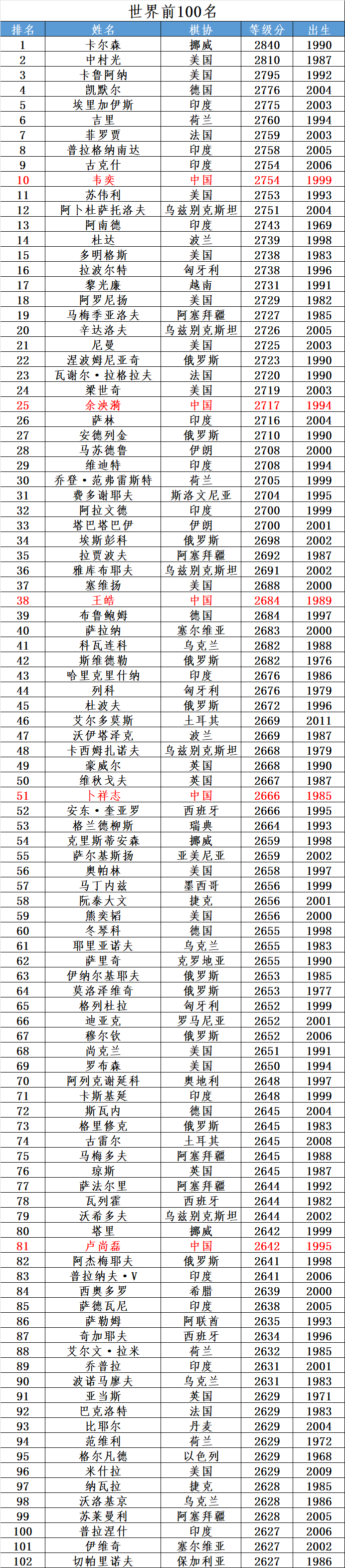 等级分 | 世界前100名(2026年2月)