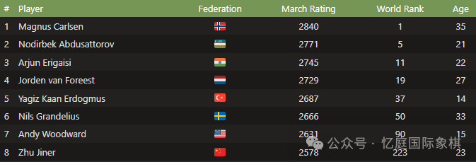 瑞典近十年头号特级大师格兰德利乌斯,是阵容中除卡尔森外唯一一位 30 岁以上棋手;23 岁的中国棋手朱锦儿则补齐了参赛阵容,她目前位列女子世界第二,获得了出战超级赛事的宝贵机会。