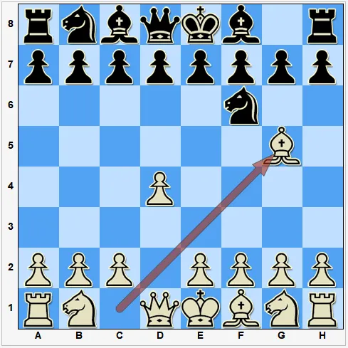这类开局最具代表性的就是王翼印度进攻,它与黑方古印度防御子力配置差不多,只是颜色相反:
