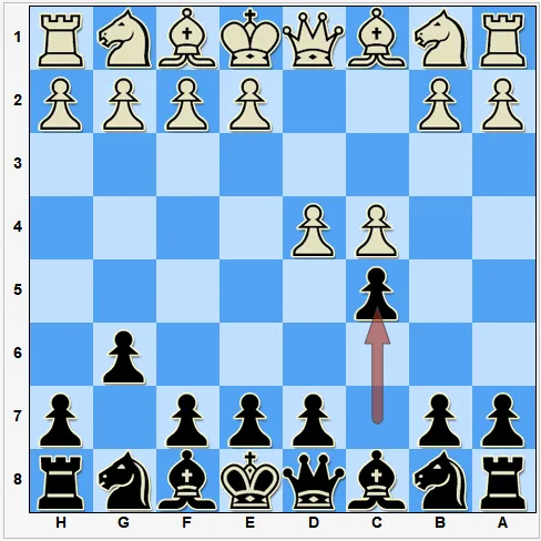后兵开局现代变化黑方标志性走法是1...g6,2...c5,如下图: