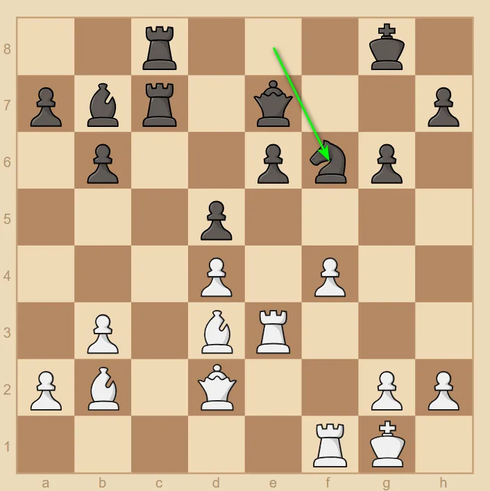 他通过破坏黑方的王翼兵型,将静态优势转化为了动态优势。这是一个你应当时刻铭记的战术技巧:当你在出子上领先时,破坏敌方王的庇护所是关键。