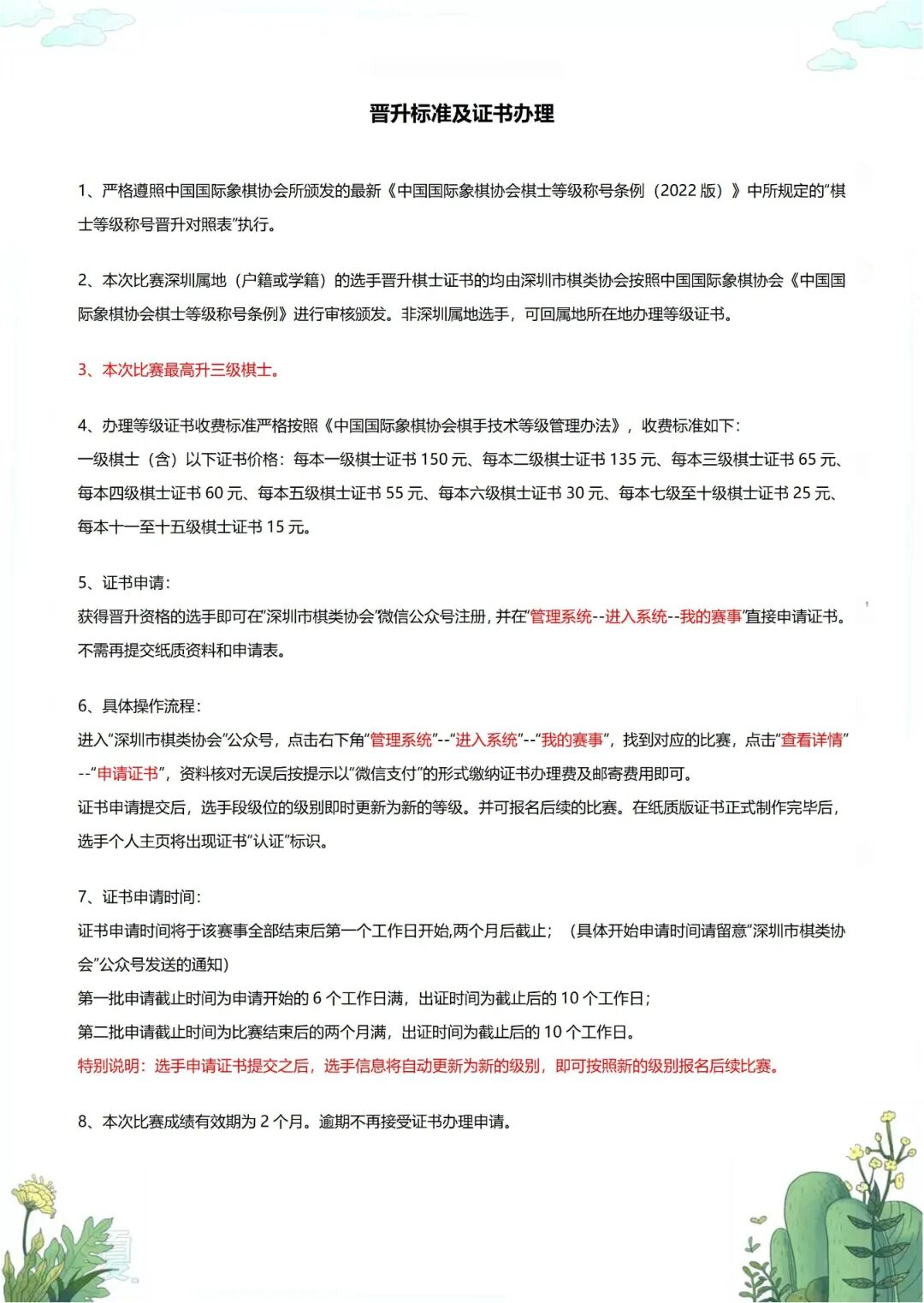 4、报名参赛者须按现有棋士等级证书报名,不得跳级上报。