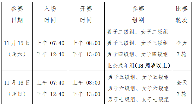 (二)竞赛分组:除业余成年组,其他组别男女独立成组。(若女子人数不足10人则与同级别男子组并组)