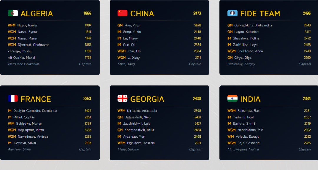 国际棋联11月7日公布了2025年国际棋联世界女子国际象棋团体锦标赛各队参赛阵容。现女子世界排名第一的四届世界棋后侯逸凡将率领中国女队参赛。