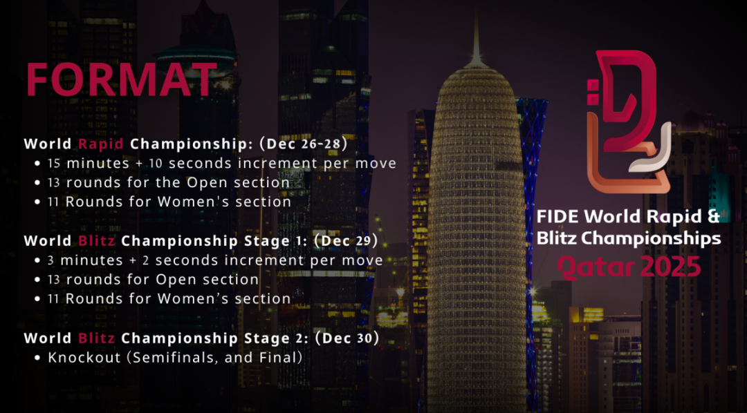 总奖金高达一百万欧元的2025国际棋联快棋超快棋世锦赛将于12月25日至30日在卡塔尔首都多哈举行,这是多哈继2016年之后,第二次举办本项赛事。