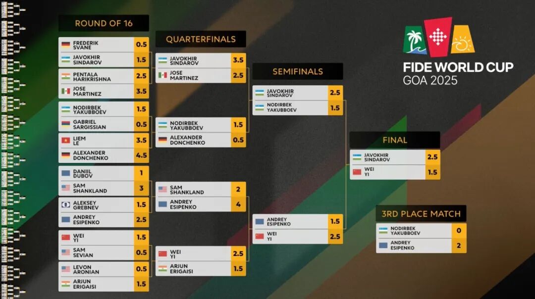 会师冠亚军决赛的韦奕与辛达洛夫在两盘慢棋赛中均战成和棋,双方不得不通过快棋加赛,决出优胜者。这也是世界杯赛历史上,第六次通过快棋加赛决出冠亚军。