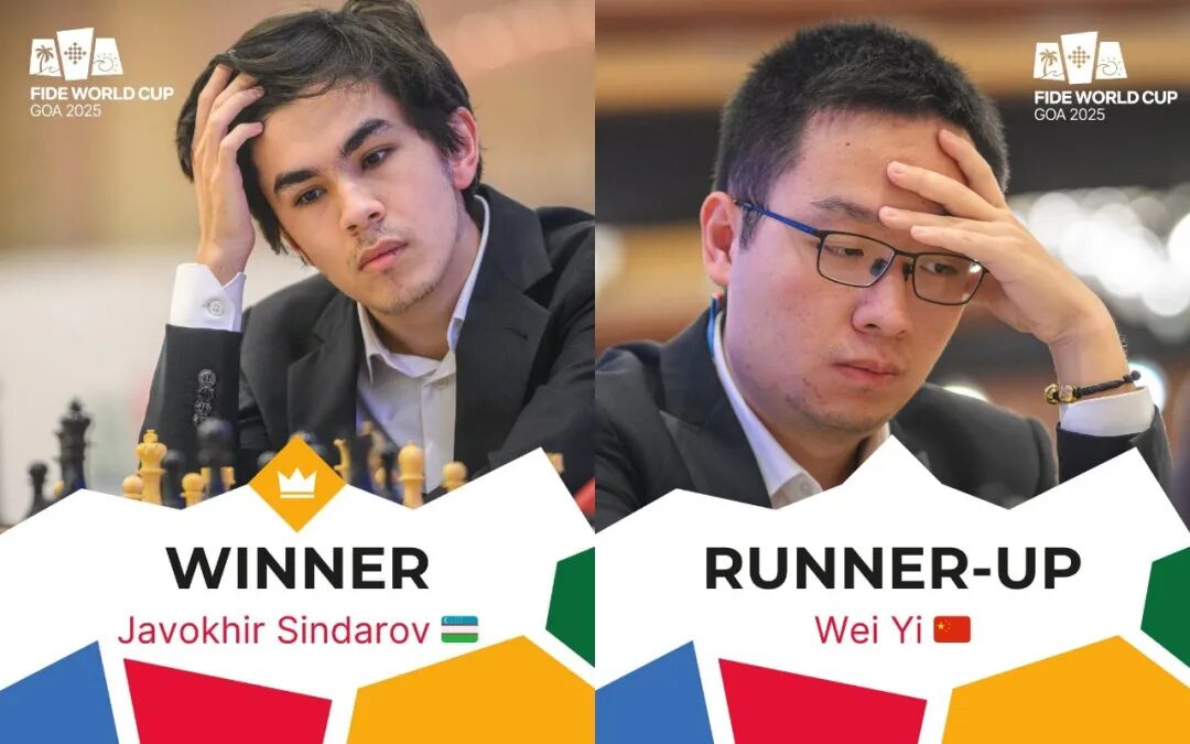 北京时间11月26日晚,在印度西海岸海滨城市果阿进行的2025年国际棋联世界杯赛进行了冠亚军决赛的快棋加赛。中国棋手韦奕在15分钟快棋赛中以1和1负,不敌乌兹别克斯坦棋手辛达洛夫,获得亚军。辛达洛夫获得冠军。