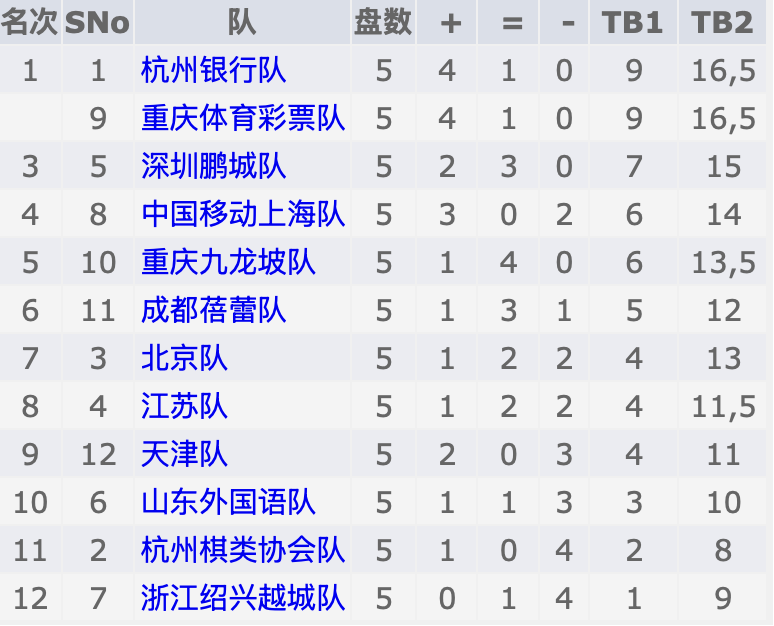 明天(9月1日)将展开第一站最后一轮的较量,杭州银行的对手是山东外国语队,重庆体彩对阵天津队,深圳鹏城则与杭州棋类协会队交锋。