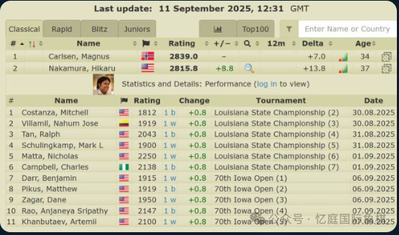 正是出于这一考虑,他参加了路易斯安那州锦标赛,对阵业余棋手取得了 7 战 7 胜的完美战绩。结果是:他的有效对局数增加了 6 盘,且对自己的排名毫无风险。此后,他在年底前还需再下 16 盘棋。而在爱荷华州锦标赛中,历史再度重演 —— 他 5 战 5 胜,进一步填补了对局数缺口。