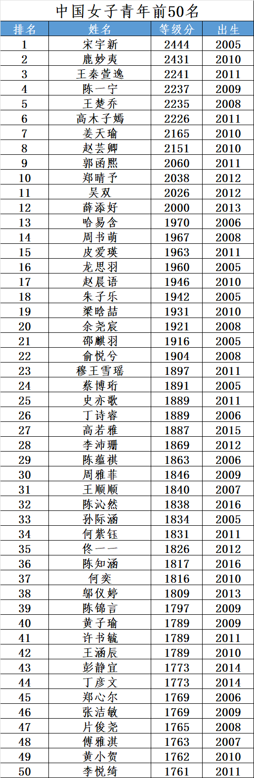 等级分 | 中国女子青年前50名(2025年10月)