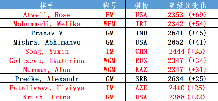 世界前100名和女子世界前100名榜单中,等级分上涨最多的十位棋手如下所示: