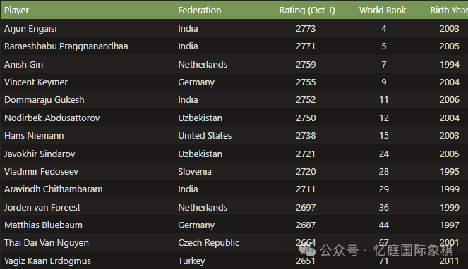 赛事阵容中,实时等级分最高的选手是状态正佳的特级大师凯默尔。他在欧洲团体锦标赛与欧洲俱乐部杯赛事中表现亮眼,凭借此次出色发挥获 18 个等级分,攀升至世界第四位。与他一同参赛的还有其他 2003 年后出生的新星,例如特级大师阿卜杜萨托洛夫、辛达罗夫以及尼曼。其中,尼曼已在 X(原 Twitter)平台上表达了对赛事邀请的感谢。