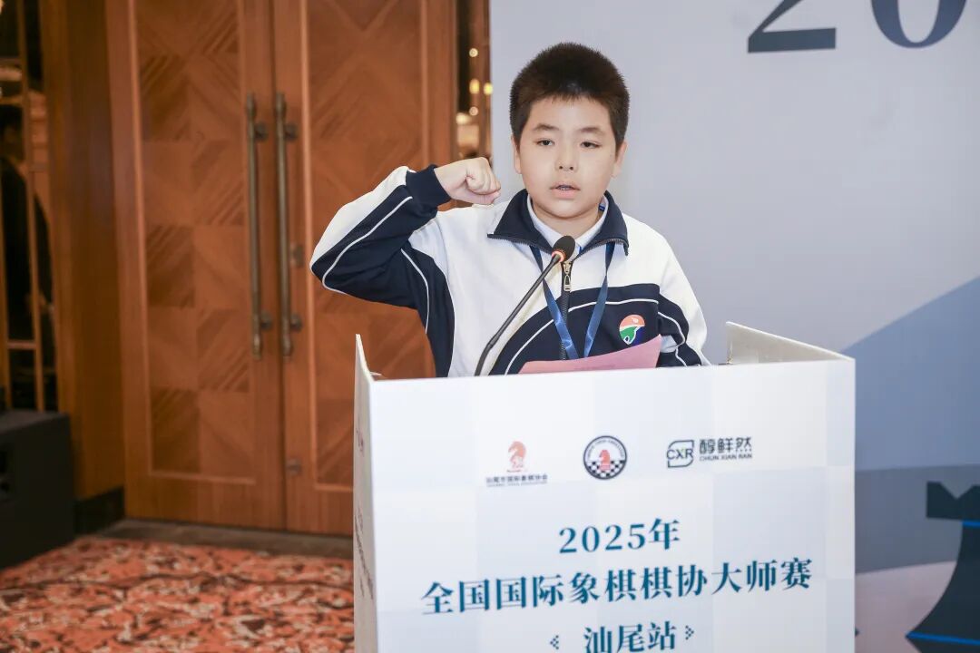 在开幕式上,汕尾市文化广电旅游体育局局长郑进铅发表了热情洋溢的致辞。他指出,汕尾是一座拥有绵长海岸线与深厚人文底蕴的城市,此次赛事的举办不仅是对汕尾体育文化发展的有力推动,更是国际象棋智慧魅力与汕尾城市风采的完美融合。他希望各位棋手在棋盘上纵横驰骋,赛出佳绩,同时也祝愿各位来宾在汕尾的碧海蓝天与青山绿水之间,收获一段“棋”乐无穷、流连忘返的美好时光。