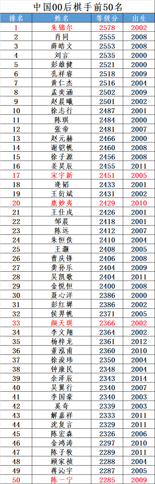 等级分 | 中国00后前50名(2026年3月)